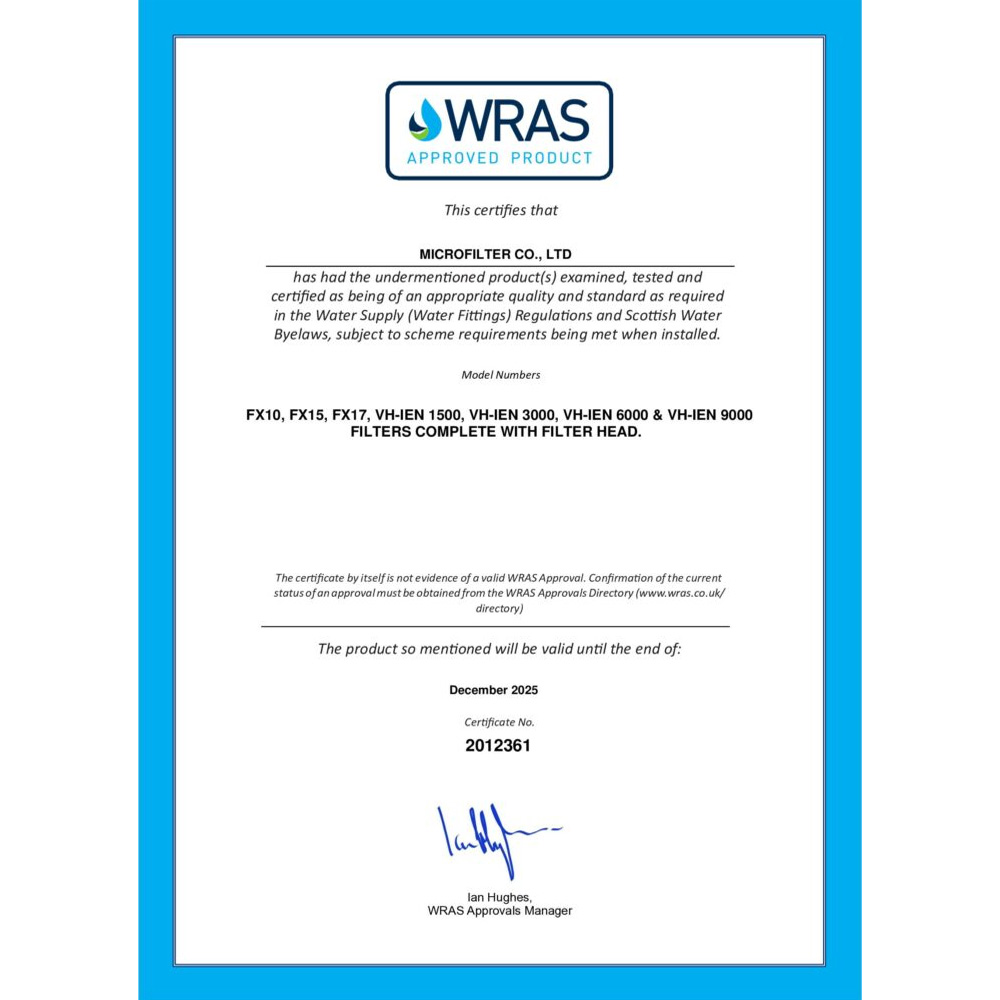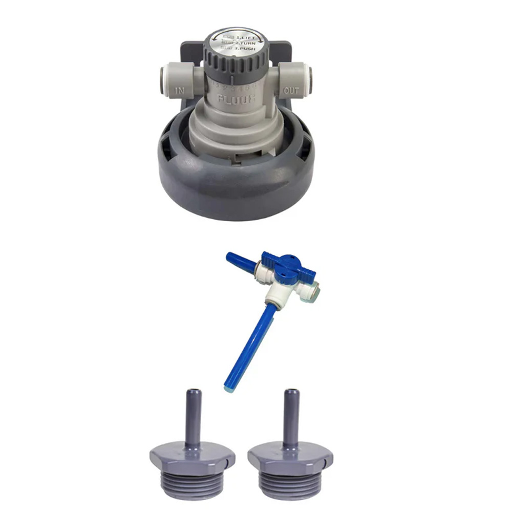 • Fittings – Filter Cartridge, Flush Valve, 2x 3/8 inch Stem to ¾ inch BSP male adapters (for ¾ inch hose installation)
