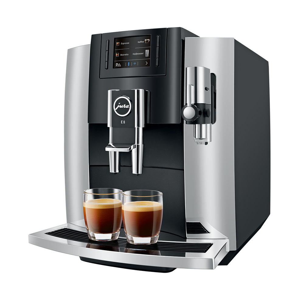 Jura E8 Chrome the ultimate bestseller and most successful automatic coffee machine in JURA’s history – now even easier to use, with an even greater variety of specialities and an even more sophisticated design, with a daily capacity of 50 drinks.