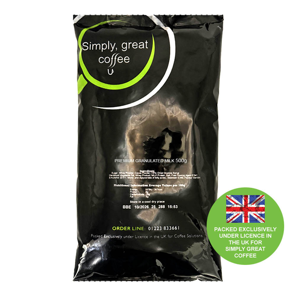 The product is produced from our own unique recipe to produce the finest 100% granulated skimmed milk and is made exclusively under license in the UK for Coffee Solutions.